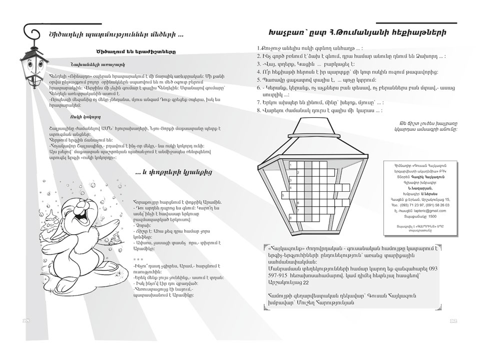Լապտերիկ մանկական հանդես. հեքիաթներ, մանկական բանաստեղծություններ, առականի, հանելուկներ, մանկական խոհանոց, ժամանց. հումոր, հետաքրքրաշաժ տեղեկություններ բնության մասին, պատմության էջեր, դրվագներ