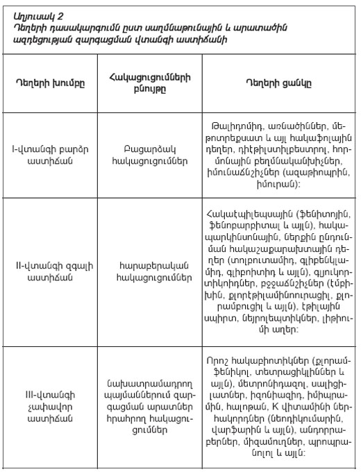 Դեղերը կարող են հրահրել սաղմնաթունային, սաղմնակործան, արատածին և պտղաթունային ազդեցություններ (աղ.1):