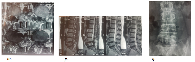 գ. ներվիրահատականռենտգեն հետազոտում՝ պատկերված է ՄՌՏ հետազոտմամբ ախտորոշված նեղացման տեղակայմանը համապատասխանող ոսկրային դեֆեկտը L4-L5 մակարդակի (ցույց է տրված սլաքով)