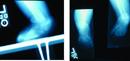 Первые два месяца ортез снимается лишь для гигиены ребенка, далее постепенно удаляется, сначала - на 2 часа, затем по нарастающей - до 8 часов и только в бодрствующем состоянии ребенка. При этом родители, заранее обученные, выполняют с ребенком пассивные упражнения для получения гиперкоррекции стопы. По достижении детьми 6-месячного возраста в обязательном порядке производится рентгенография стопы в прямой и боковой проекциях с упором (рис. 4).